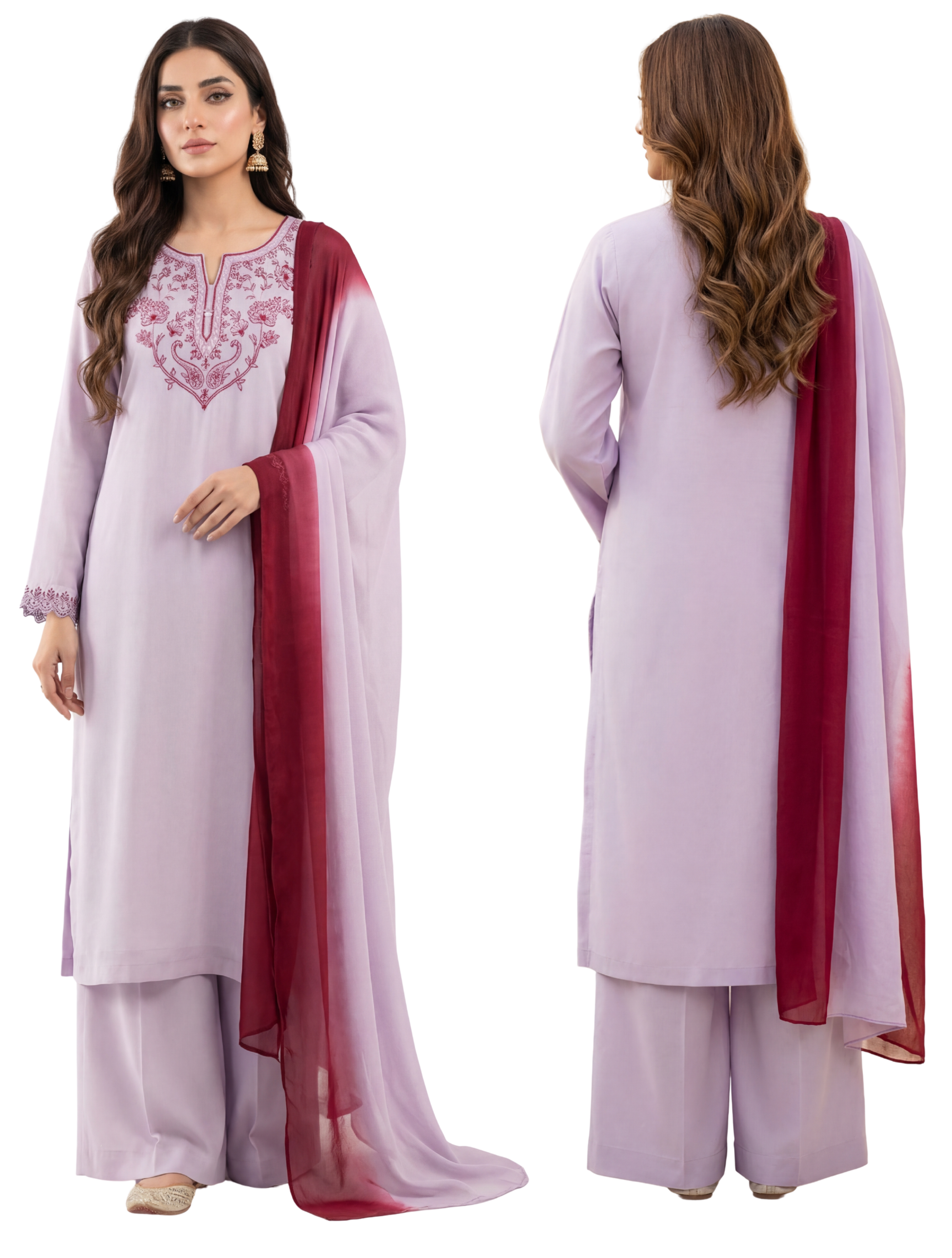 Paired with matching trousers and a contrasting deep maroon dupatta, this three-piece suit creates a refined and eye-catching look ideal for festive gatherings, family events, and semi-formal occasions.